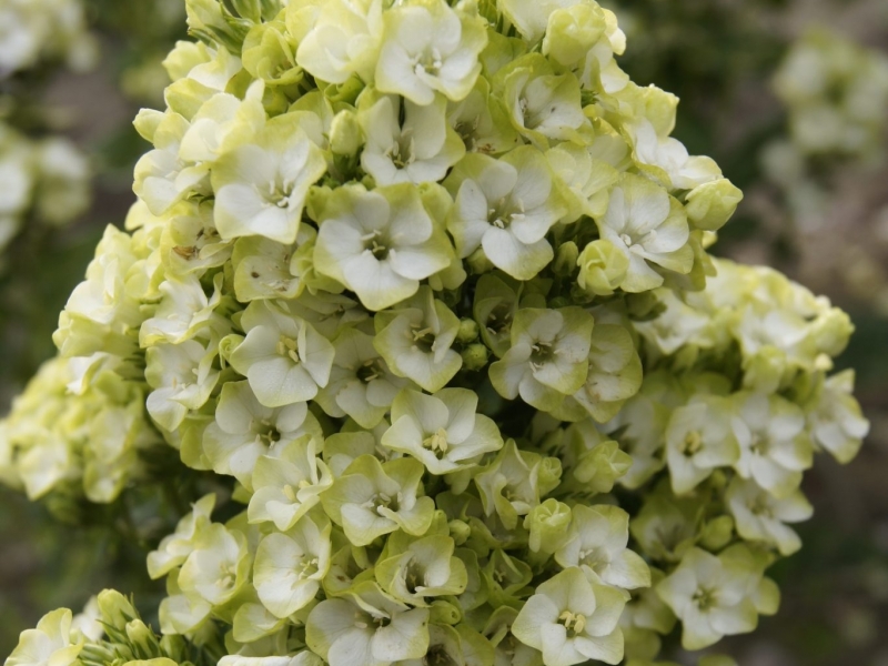 Рассада флокса метельчатого Green Leave будет отлично смотреться у водоемов, зон отдыха и в смешанных посадках. Высота взрослого растения не превышает 80 сантиметров. В июле формируются цветоносы, состоящие из зеленовато-белых звездчатых цветов. Кусты сохраняют декоративность до сентября.