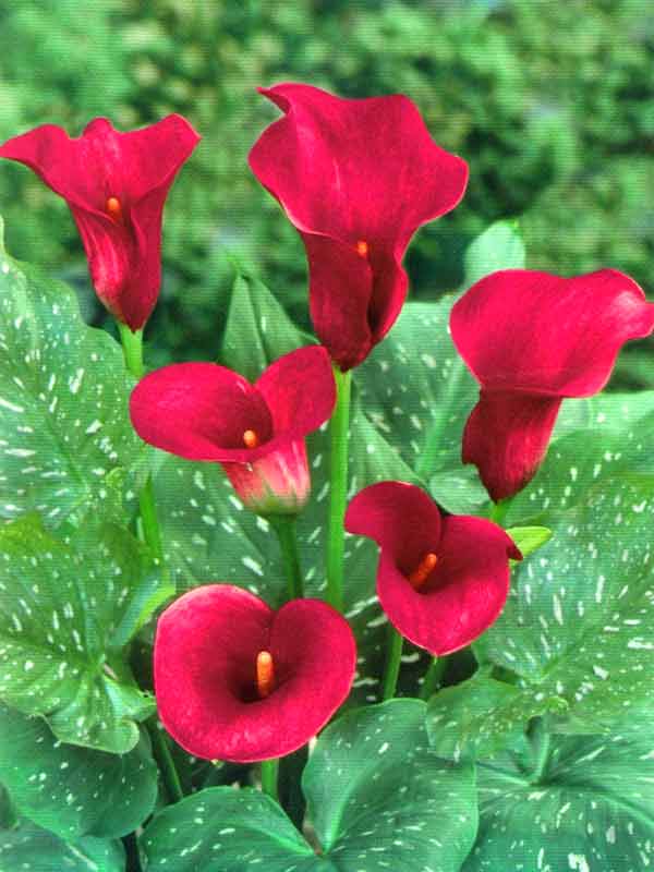 Луковицы Каллы гибридной Ред Маджести (Red Majesty Calla) дают сразу несколько цветоносов, по этому шикарным цветением вы успеете насладиться в полной мере. Темно-зеленые блестящие листья покрыты мелкими желтыми точками. Соцветие представлено невзрачным ярко-желтым початком, который окутан волнистым покрывалом насыщенного красного цвета. Каллу Ред Маджести выращивают как в открытом грунте, так и в комнатных условиях. Цветы долговечны и длительное время сохраняют свою свежесть, поэтому их часто используют в составлении цветочных композиций и букетов. В саду прекрасно смотрятся рядом с хостами и лилиями.