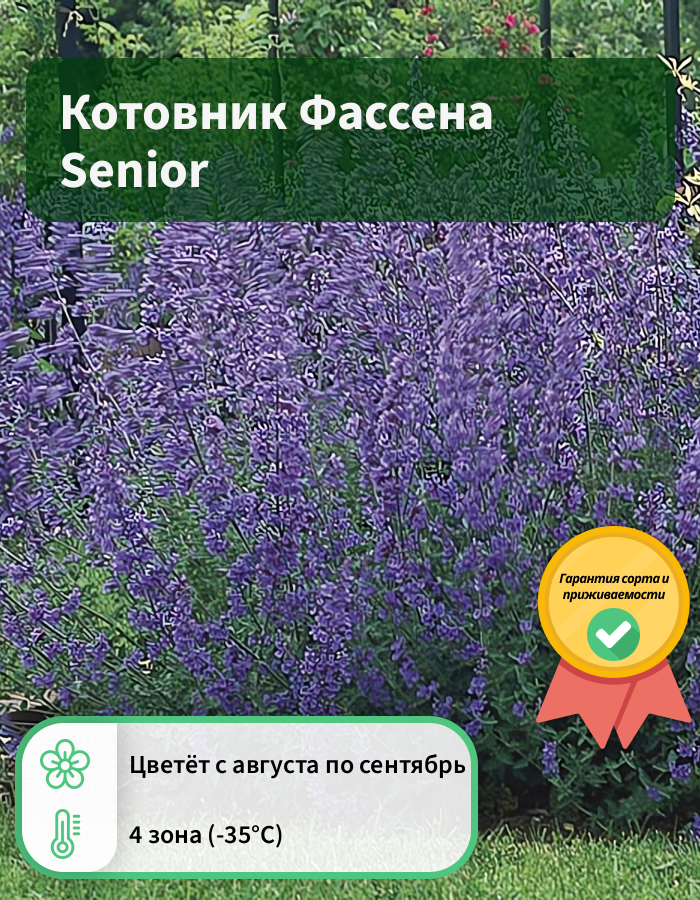 Саженцы котовника Фассена Senior лучше всего проявляются свои декоративные качества на солнечных участках с легкой, хорошо дренированной почвой. Сорт морозостойкий, засухоустойчивый, отличается компактными размерами. Высота взрослого растения всего 30-40 см. Побеги прямостоячие, обильно покрыты насыщенно-зелеными листочками. В июне раскрываются первые цветочки, собранные в колосовидные соцветия фиолетово-голубого цвета. Цветет многолетник до первых заморозков. Применяют саженцы котовника Фассена Senior чаще всего в одиночных и групповых посадках, оформления бордюров.