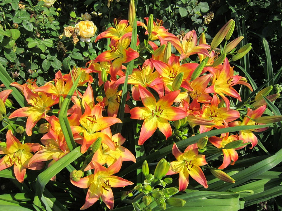Цветки, раскрывающиеся с июня по июль, удивляют экзотической двухцветной окраской. Лепестки с розово-оранжевыми краями ближе к центру приобретают насыщенный лимонно-желтый оттенок с небольшим крапом вишневого цвета. Цветки раскрываются по очереди, и цветение продолжается длительное время.