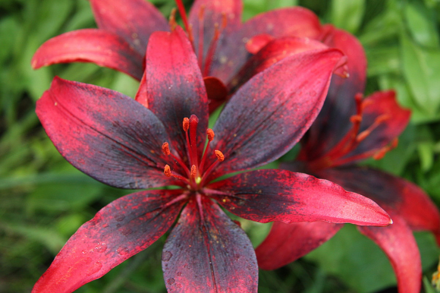 Окраска цветка : алый с черным напылением в центре