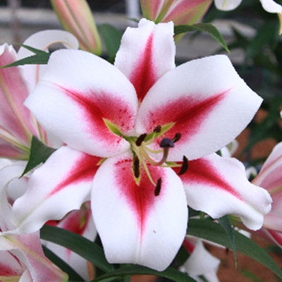 Окраска цветка : белый с насыщенно-малиновыми мазками из центра и темными пыльниками