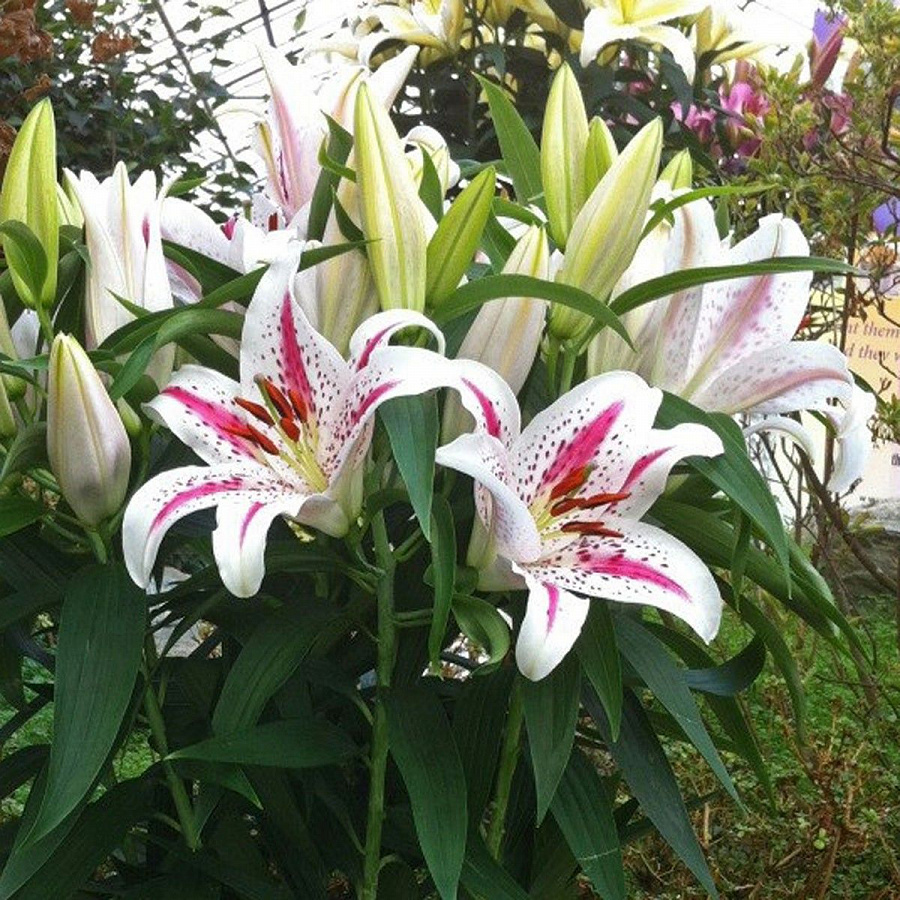 Луковицы лилии восточной Солюшн (Lilium hybrid oriental Solution) принадлежат к очень нарядному сорту с крупными ароматными цветами. Многолетник эффектно смотрится в групповых и смешанных посадках, в букетах. Цветки крупные, в диаметре достигают 20-22 см. Раскрытые бутоны отличаются белоснежным фоном, на котором выигрышно смотрятся желтая звезда, расположенная в центре, ярко-малиновый крап и мазки. Высаживать лилию восточную Солюшн следует в сухую, рыхлую, питательную, водопроницаемую почву на хорошо освещенные, защищенные от ветров места.